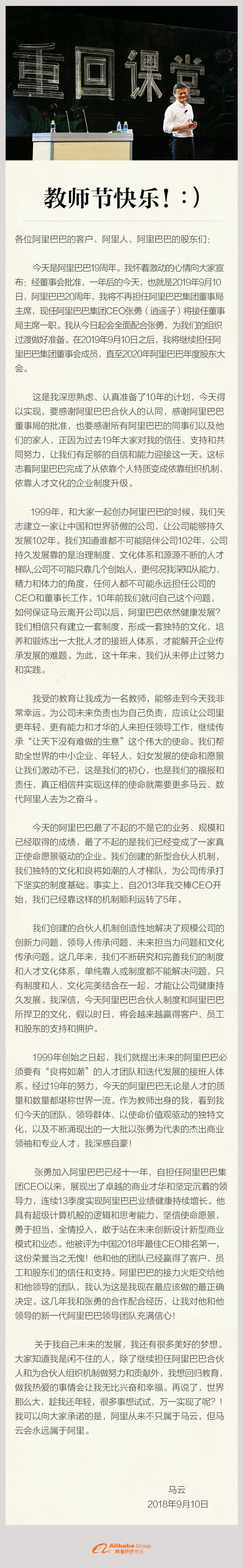 一年后的今天,即2019年9月10日,他將不再擔任集團董事局主席,屆時由現任集團CEO張勇接任。